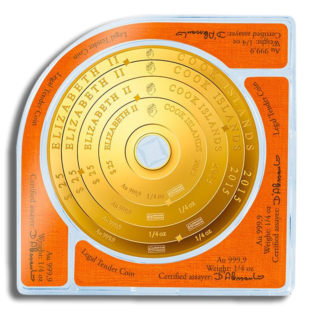 1 oz .9999 pure gold Engelhard Prospector round, carded for guaranteed authenticity and premium quality.