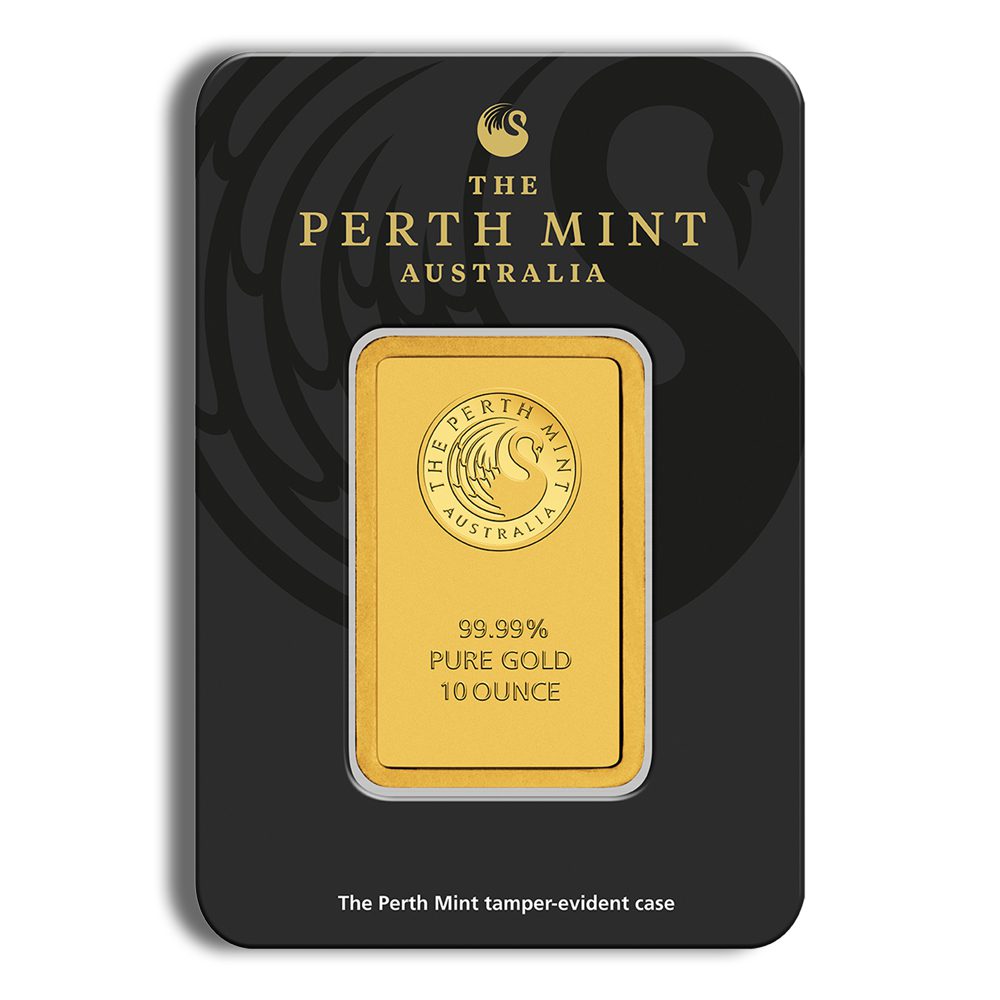 The 10 oz Gold Bar from Perth Mint is a top-tier investment-grade bullion bar crafted from .9999 fine gold. Encased in a secure card, this bar guarantees authenticity and purity, making it a preferred choice for serious gold investors and IRA eligible portfolios.