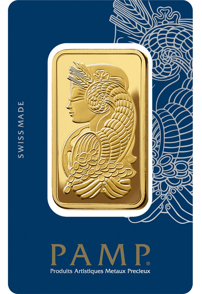 Specifications: 100 grams, .9999 pure gold, minted by PAMP Suisse, carded with assay certificate.