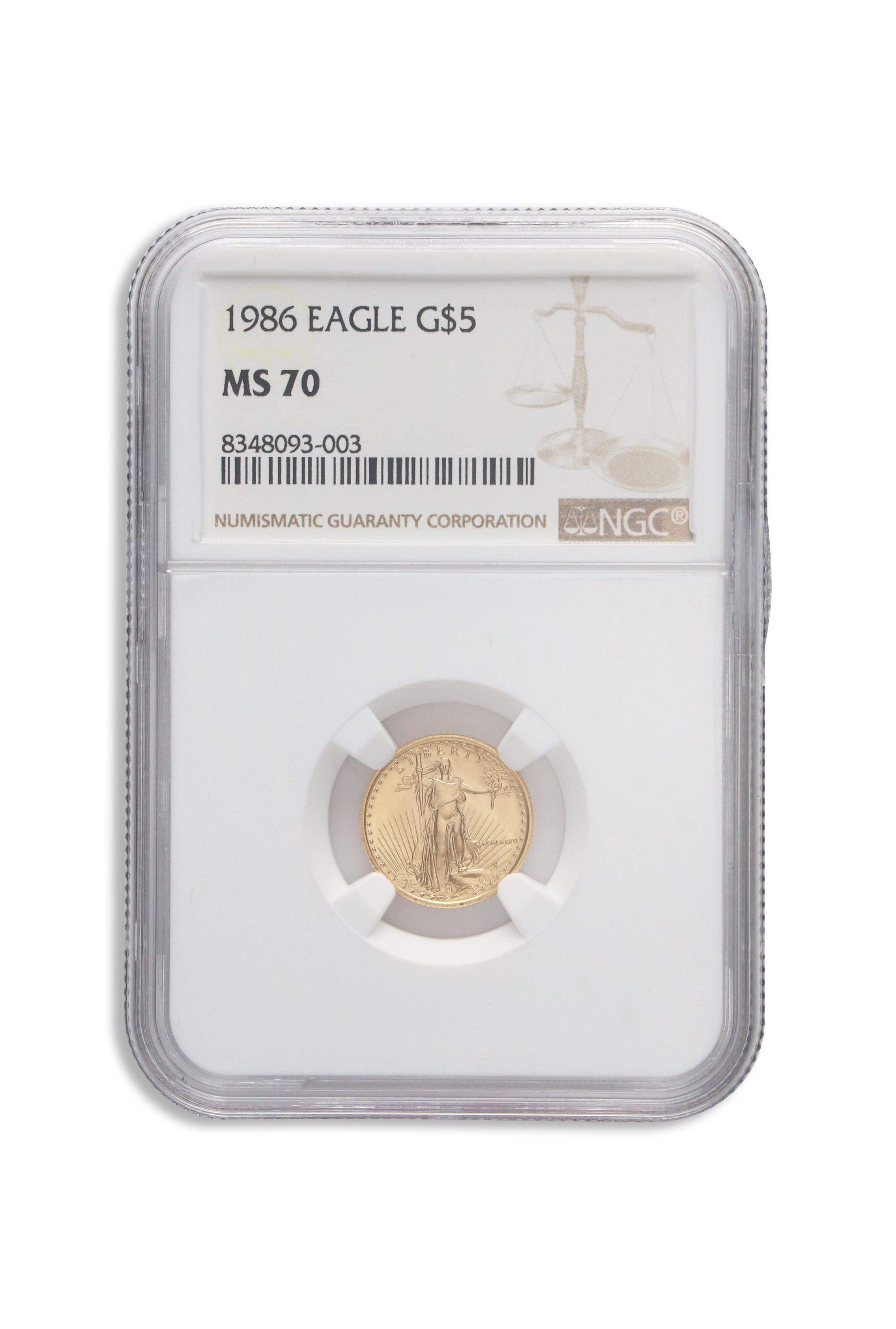 The 1986 1/10 oz Gold Eagle $5 coin graded NGC MS70 is a premium United States Mint gold bullion coin. Crafted in .9999 pure gold and weighing one-tenth of an ounce, this coin offers flawless mint state quality for both collectors and investors.