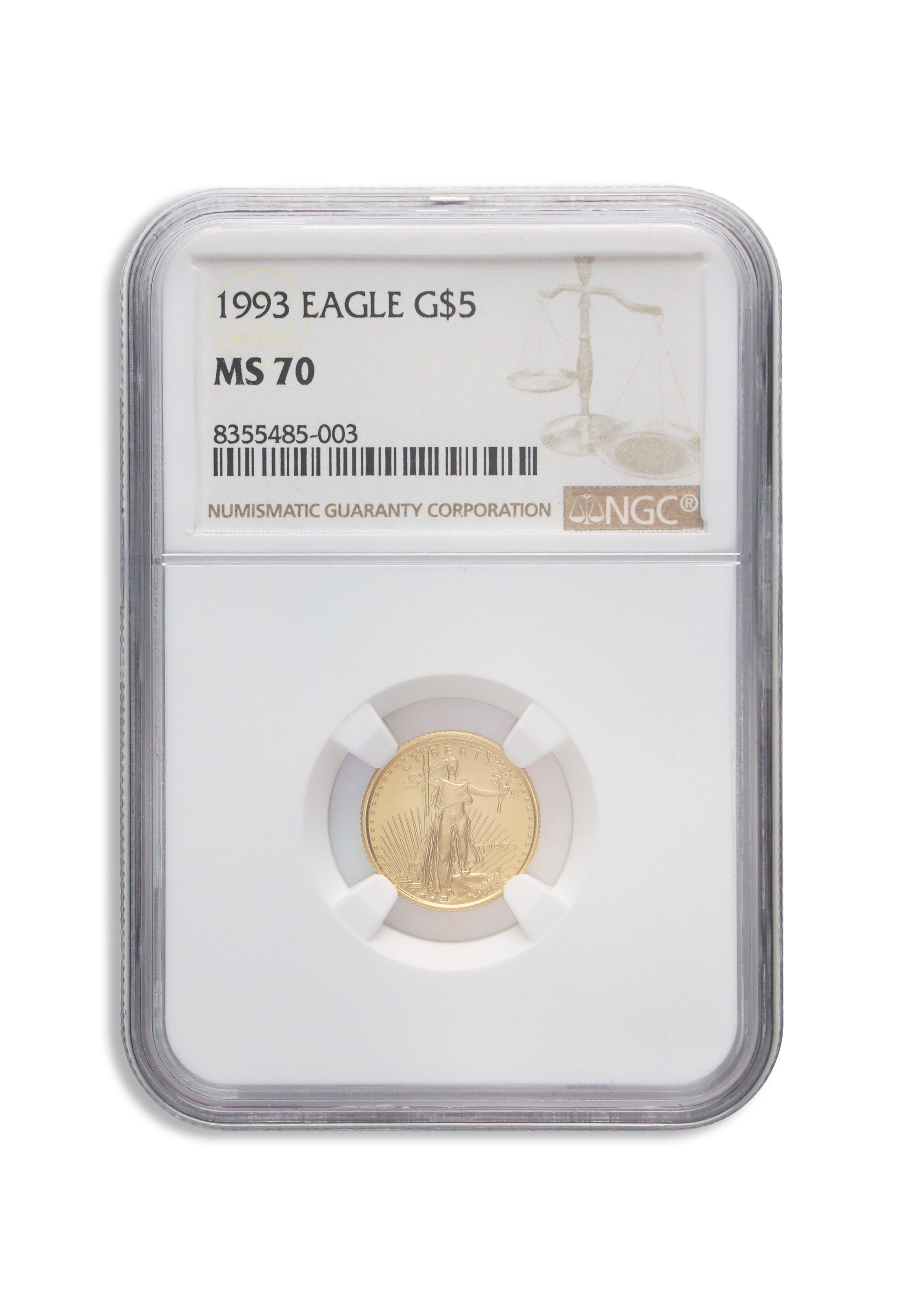 1993 1/10 oz Gold Eagle $5 NGC MS70, .9167 fine gold, perfect graded collectible U.S. Mint bullion coin.