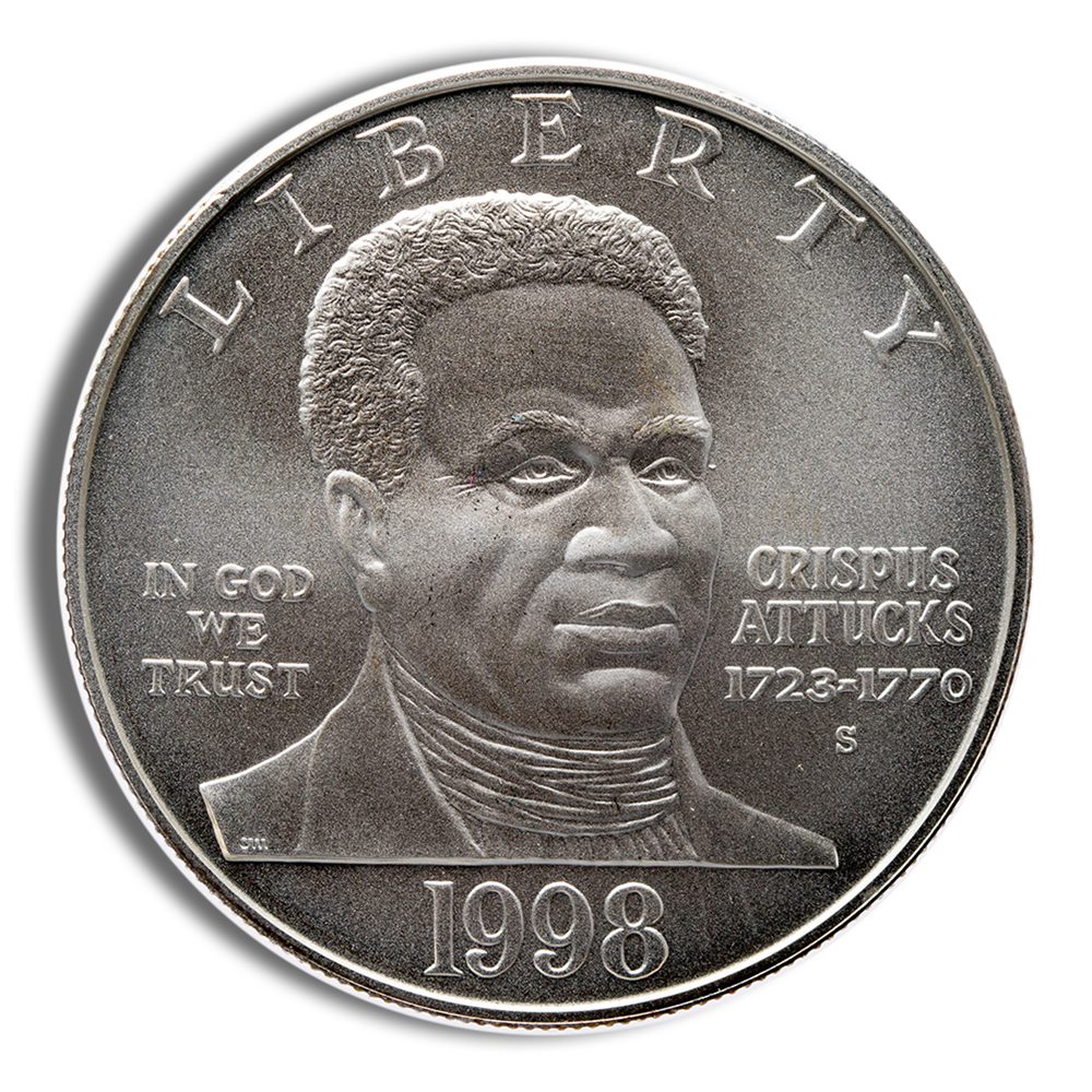 The 1998-S $1 Black Patriots Silver Commemorative Brilliant Uncirculated (BU) coin contains 1 oz of .999 fine silver and honors African American patriots. Produced by the United States Mint, this coin is a valuable collectible and silver investment.