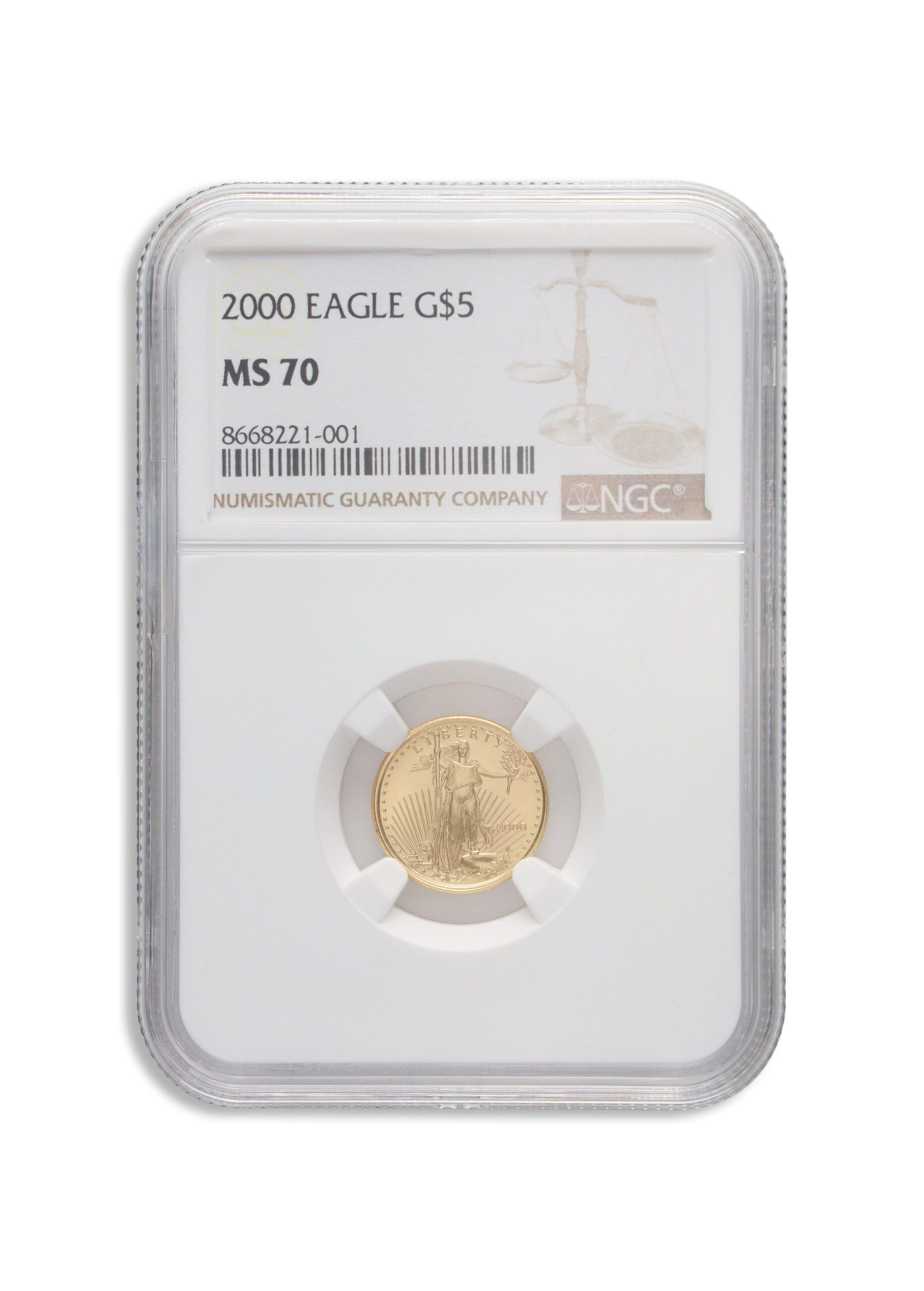 The 2000 1/10 oz Gold Eagle $5 coin from the United States Mint is a small yet valuable investment piece containing .9999 pure gold. Graded NGC MS70, it represents a perfect mint state condition, assuring collectors and investors of its flawless quality.