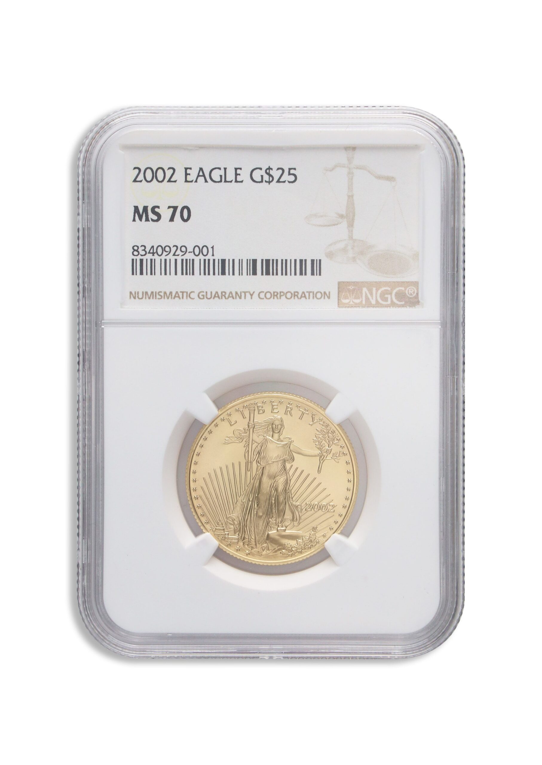 The 2002 1/2 oz Gold Eagle $25 NGC MS70 coin from the United States Mint is a flawless investment-grade piece of .9999 pure gold bullion. Graded MS70 by NGC, it represents a perfect mint state coin with no imperfections, highly coveted by collectors and investors alike.