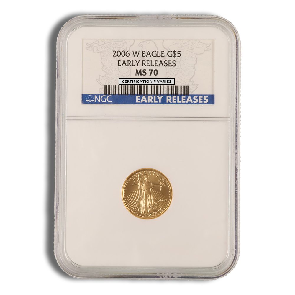 The 2006 1/10 oz Gold Eagle $5 NGC MS70 Early Releases coin is a premium grade gold bullion coin from the United States Mint. Containing .9999 fine gold and weighing one-tenth ounce, this coin is graded MS70, indicating a flawless mint state condition.