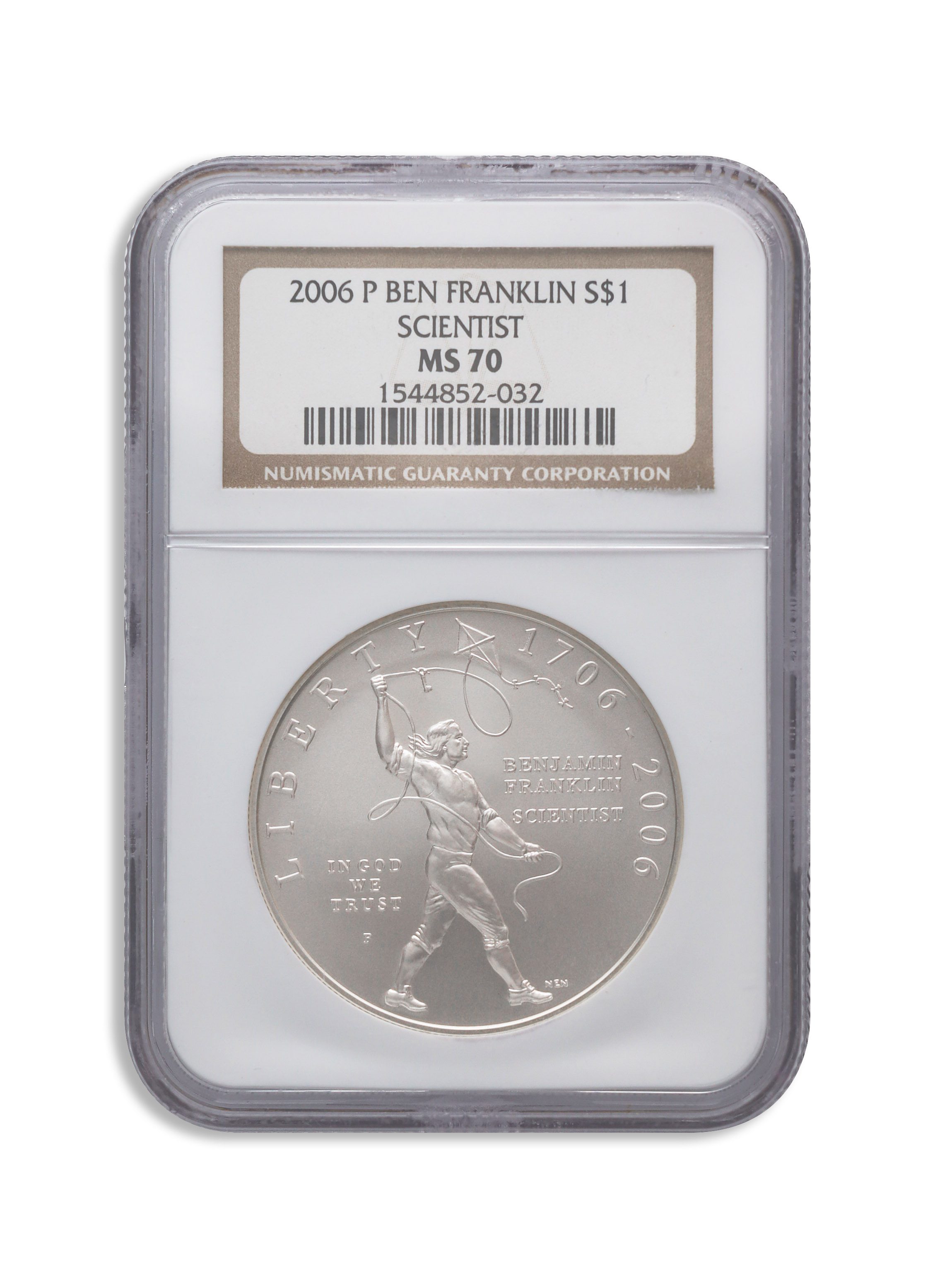 The 2006-P $1 Franklin Scientist Silver Commemorative coin honors Benjamin Franklin’s contributions with 1 oz of .999 pure silver. Graded NGC MS70, it is a pristine example of modern commemorative silver bullion.