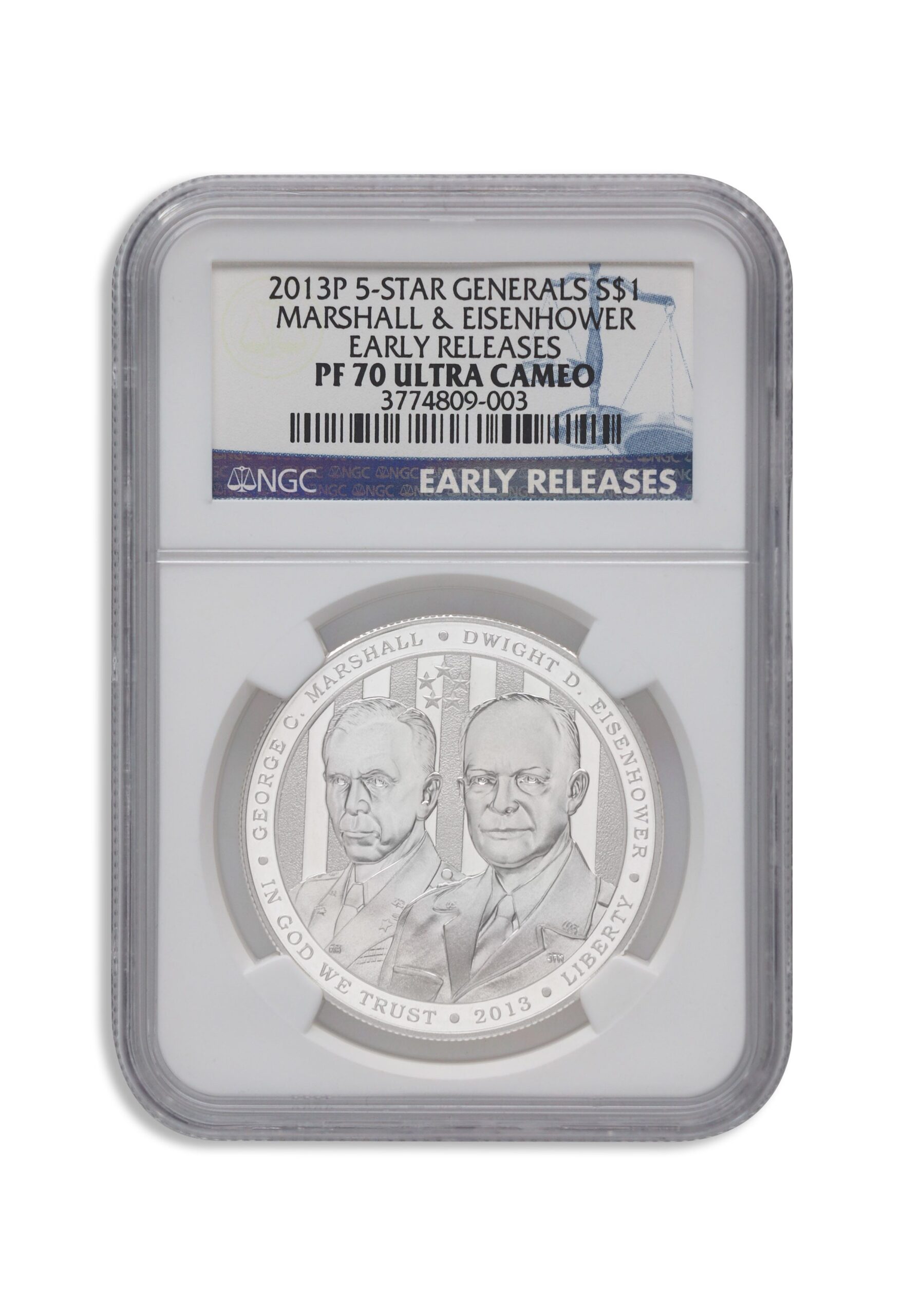 The 2013-P $1 Five Star Generals Silver Commemorative Coin is a stunning collectible struck in .999 fine silver with a perfect NGC PF70 proof grade. This NGC certified coin honors distinguished US Army generals and features exceptional detail and finish.