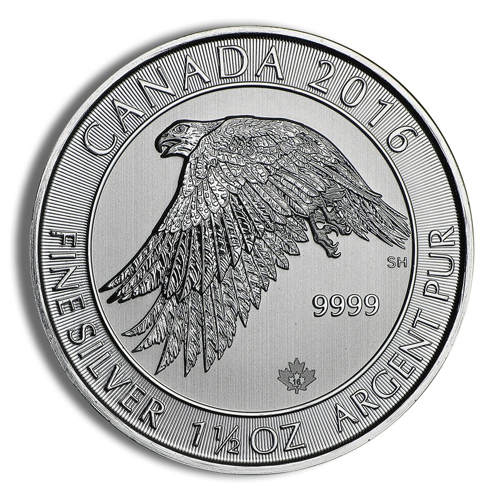 The 2016 1.5 oz Canadian Snow Falcon Silver Coin is a beautifully designed collectible bullion coin from the Royal Canadian Mint. Crafted from .9999 fine silver, this coin features a striking snow falcon motif, symbolizing Canadian wildlife heritage.