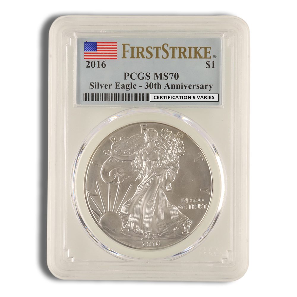 The 2016 Silver Eagle PCGS MS70 First Strike is a pristine 1 oz silver bullion coin minted by the United States Mint. Graded MS70 by PCGS and designated First Strike, this coin represents the highest quality with flawless condition and early release status.