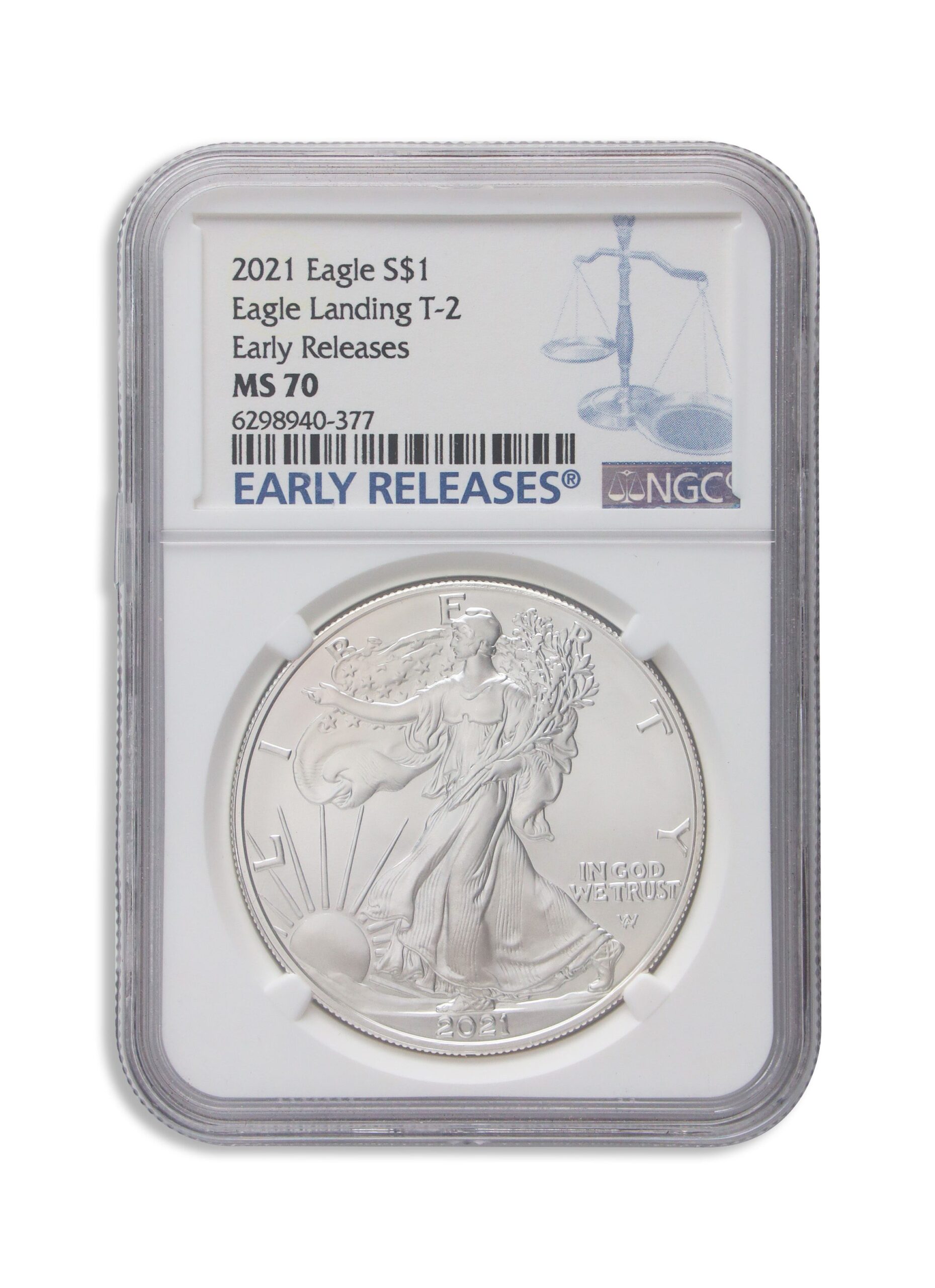 The 2021 Silver Eagle NGC MS70 Early Releases (Type 1) coin is a highly sought-after silver bullion piece struck by the United States Mint. Containing one ounce of .999 fine silver, it carries the prestigious MS70 grade for flawless mint state condition.