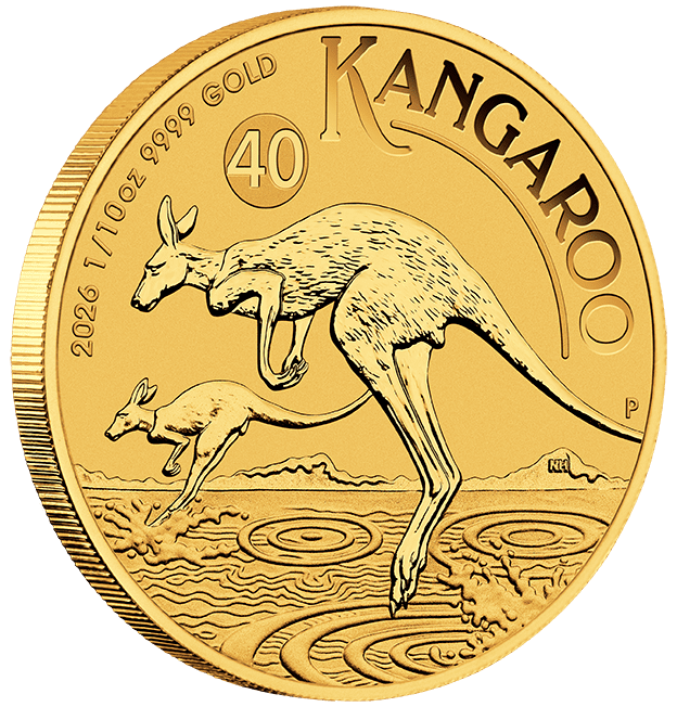 The 2026 1/10 oz Australian Kangaroo Gold Coin is minted by the Perth Mint and contains .9999 pure gold. Celebrated for its detailed kangaroo design, this coin is highly sought after by collectors and investors alike.