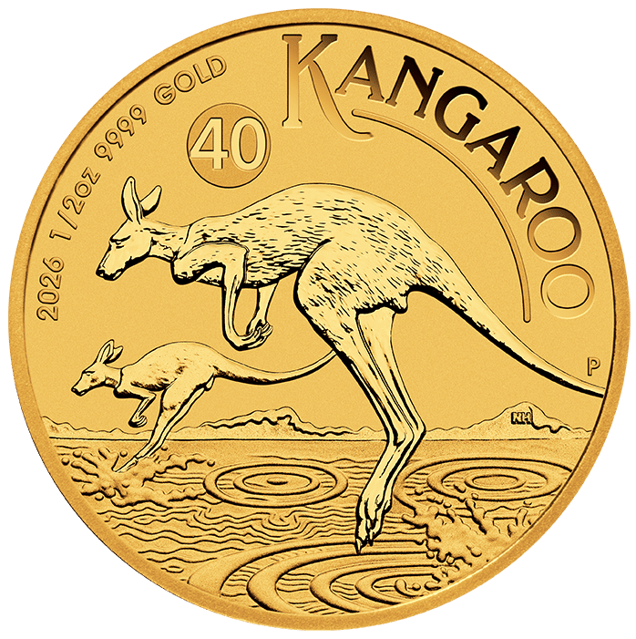 The 2026 1/2 oz Australian Kangaroo Gold Coin features .9999 pure gold and is minted by the Perth Mint. This coin showcases the iconic kangaroo design and is highly sought after by investors and collectors alike.